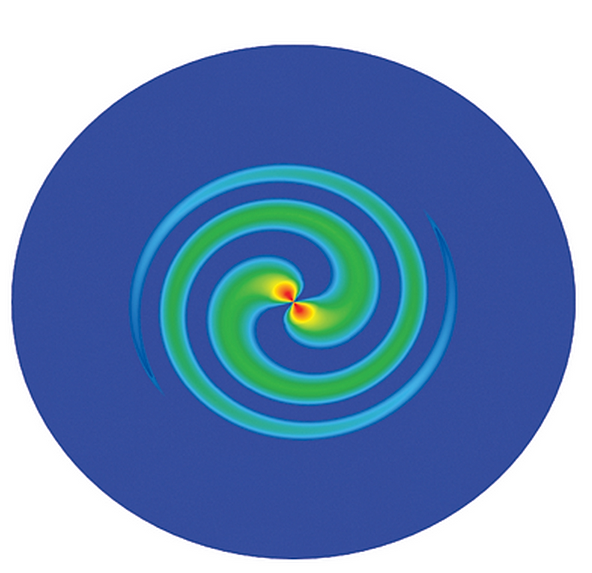 By firing two time-delayed, ultrashort laser pulses at a helium atom, the researchers found that the distribution of momentum values for these intersecting electron waves can take the form of a two-armed vortex that resembles a spiral galaxy.